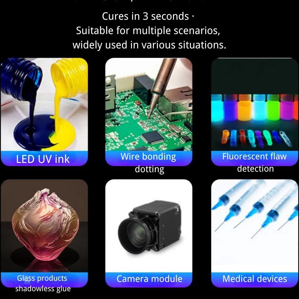 Les applications courantes incluent le durcissement des écrans de téléphones portables, le durcissement de la colle sans ombre pour le verre, le durcissement des revêtements de surface des meubles, le durcissement des couleurs de surface des carreaux/matériaux de construction, les applications de couleurs de sol et l'impression numérique à jet d'encre textile vestimentaire.
